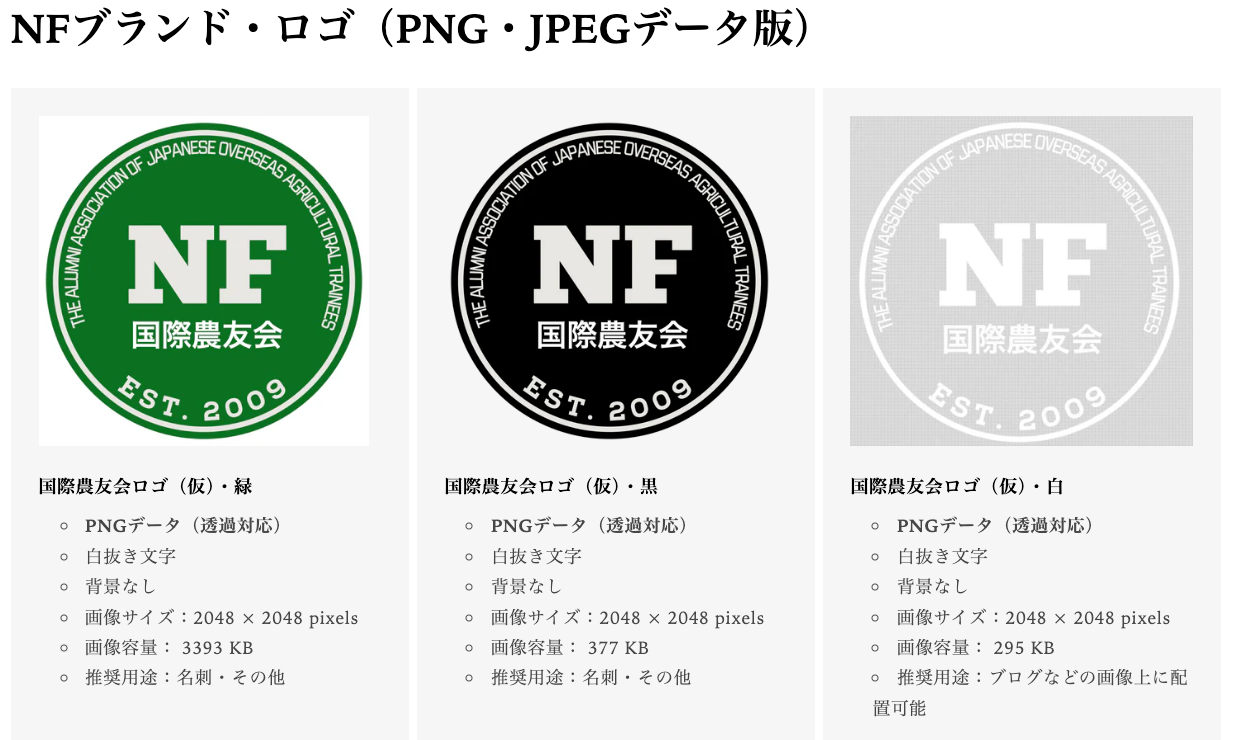 ダウンロード海外農業研修を発信していただくためのブロンドロゴを各種用意しました。全部で5種類のロゴがあり、状況に応じて使い分けていただけます。